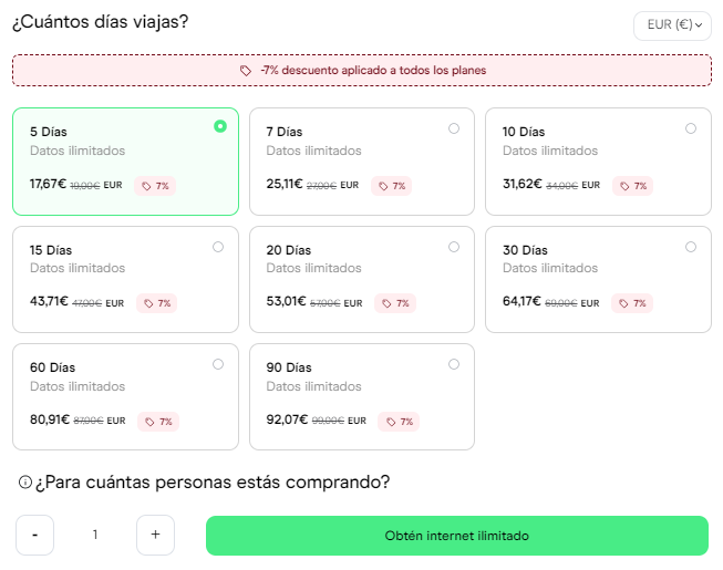 Con las eSIM de Holafly puedes mantenerte conectado mientras viajas sin usar roaming, evitando cargos adicionales en tu próxima factura. Además, con Stopover Hola Madrid te llevarás un 7% de descuento. ¡Disfruta de acceso a internet al instante con datos ilimitados!